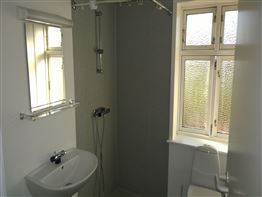 Godt badeværelse med bruser samt mulighed for tilslutning af egen vaskemaskine.